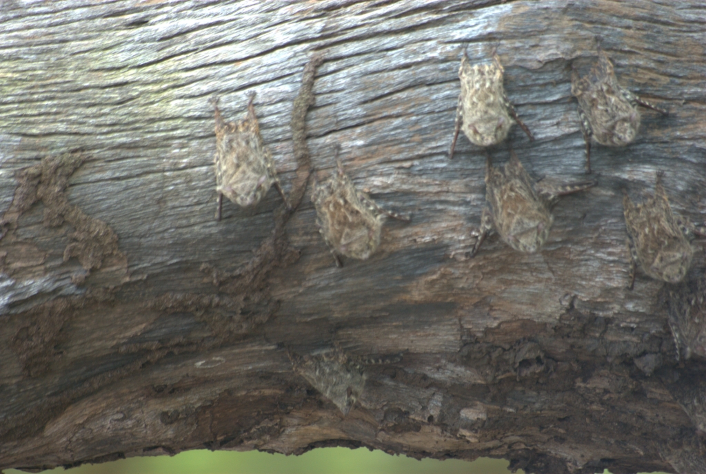 Camoflodged bats cling to log Refugio Amazaonas, Peru