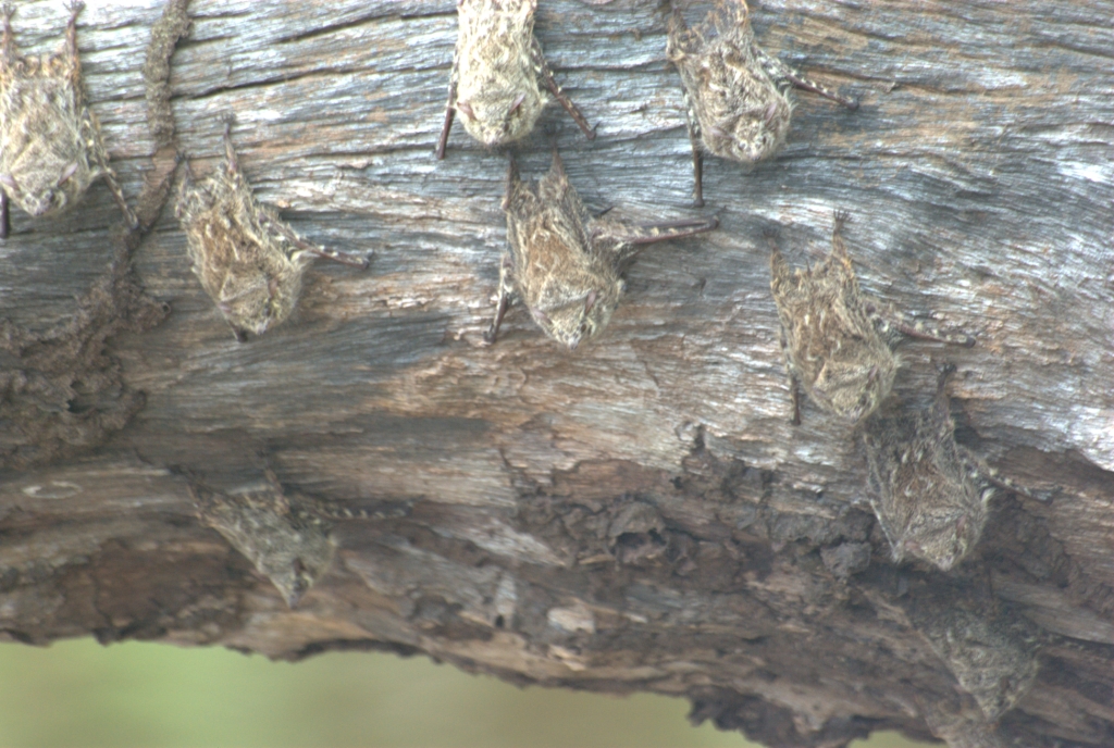 Camoflodged bats cling to log Refugio Amazaonas, Peru
