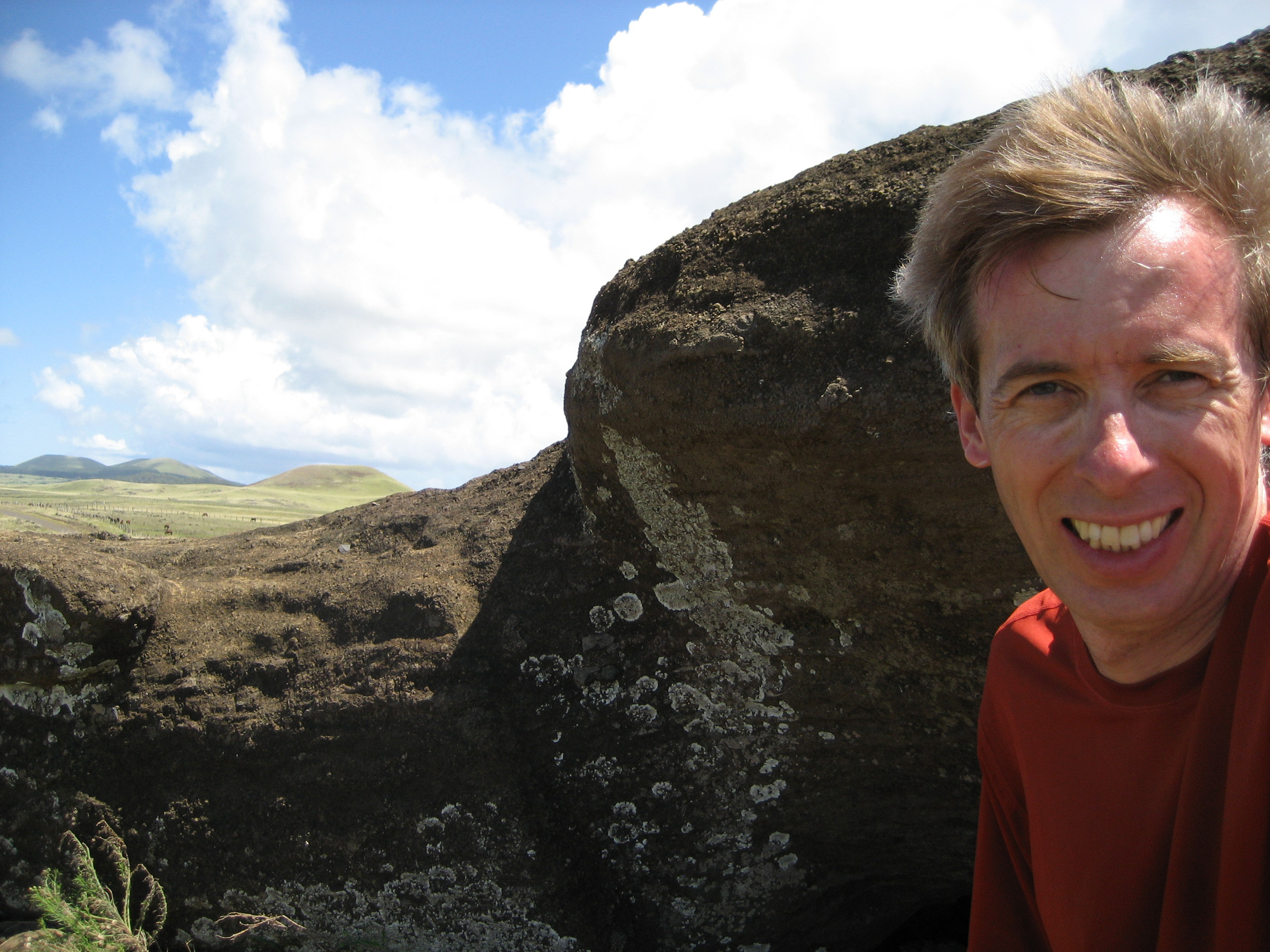 Author in front of large broken moai of Ahu Hanga Tetenga