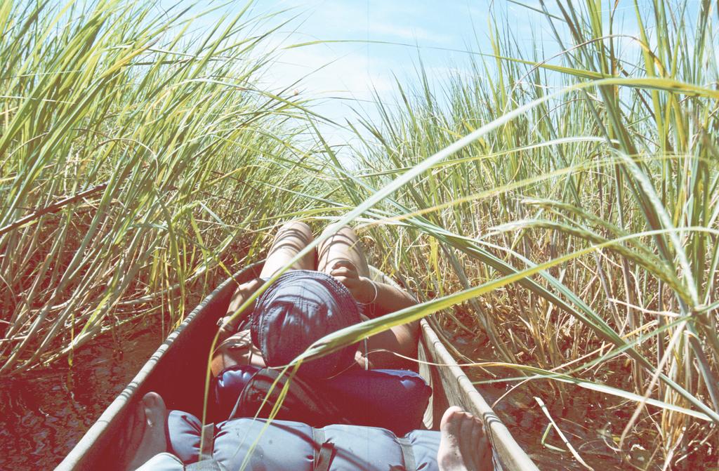 The view from the boat of the sea of reeds and lilies that is the Okavango