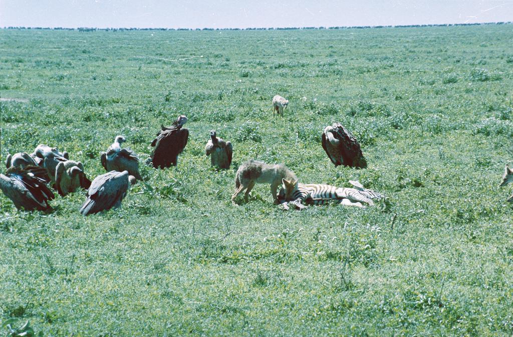 Jackel and vultures contend for a dead zebra - Serengeti NP, Tanzania