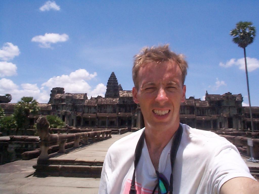 Me staring into the sun at the West (main) entrance to Angkor Wat -- Angkor, Cambodia