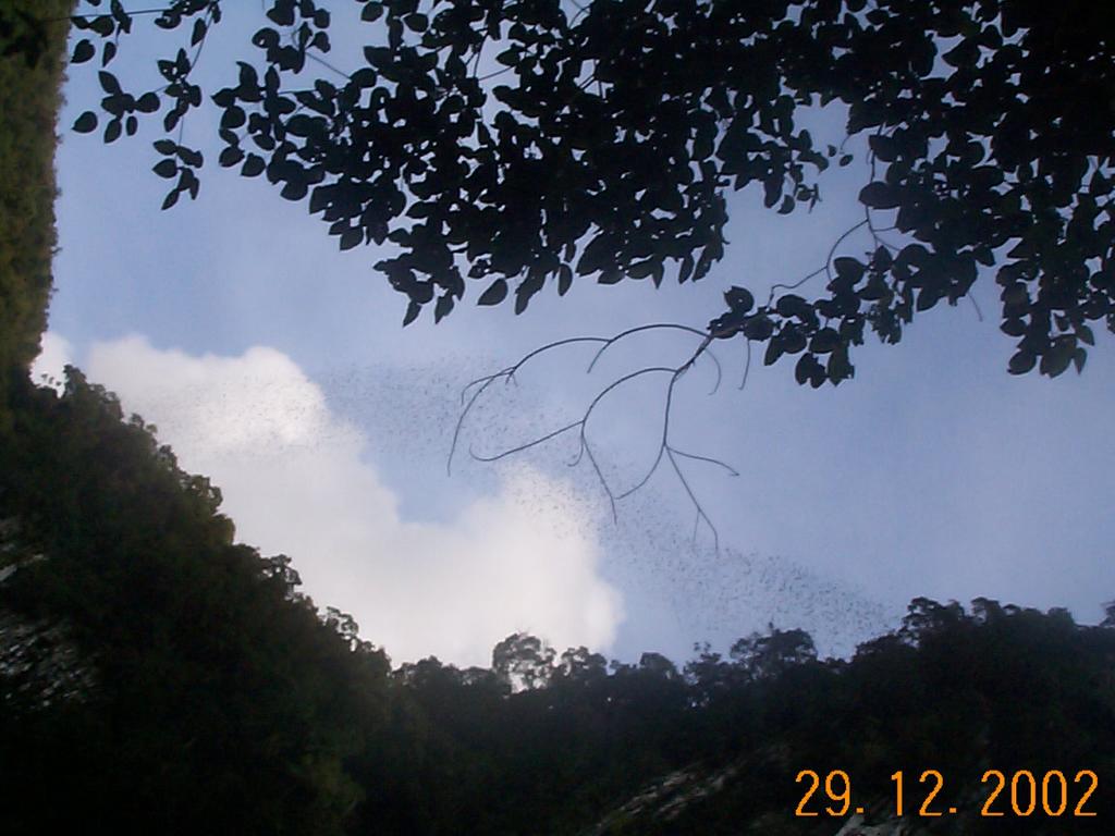 The bats emerge from Deer Cave (center left to right), Gunung Mulu National Park