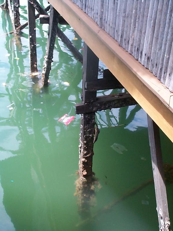 Monitor lizard clings to right side of near post. Dragon Inn, Semporna