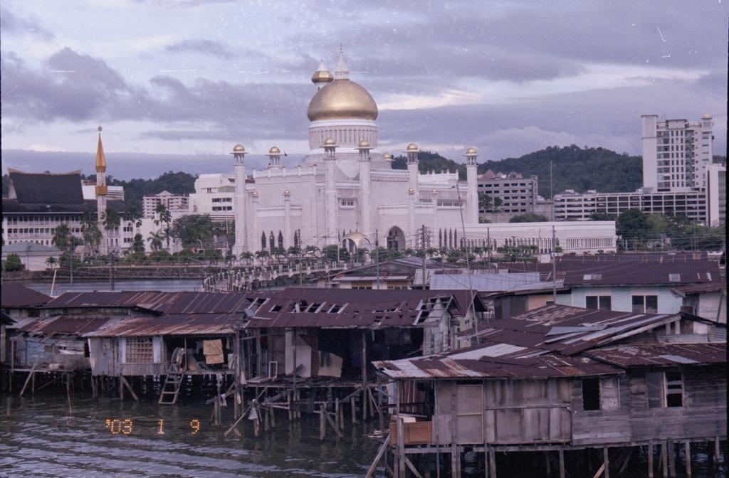 Opulence and squaller. Omar Ali Saifudden Mosque (background) water village (foreground) -- Bandar Seri Begawan, Brunei