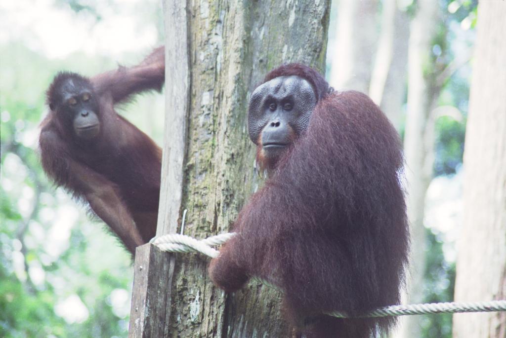 Female peeks out from behind tree near dominant male orangutan