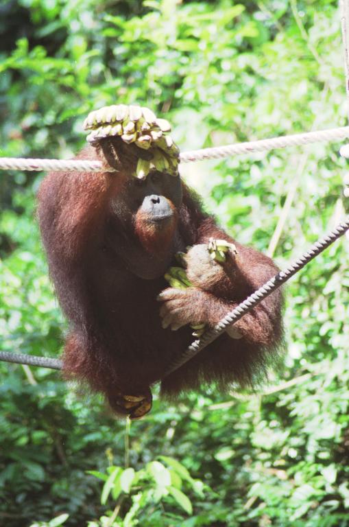 Dominant male orangutan gathers up his stash of bananas for eating elsewhere: Sepilock Orangutan Rehabilitation Center
