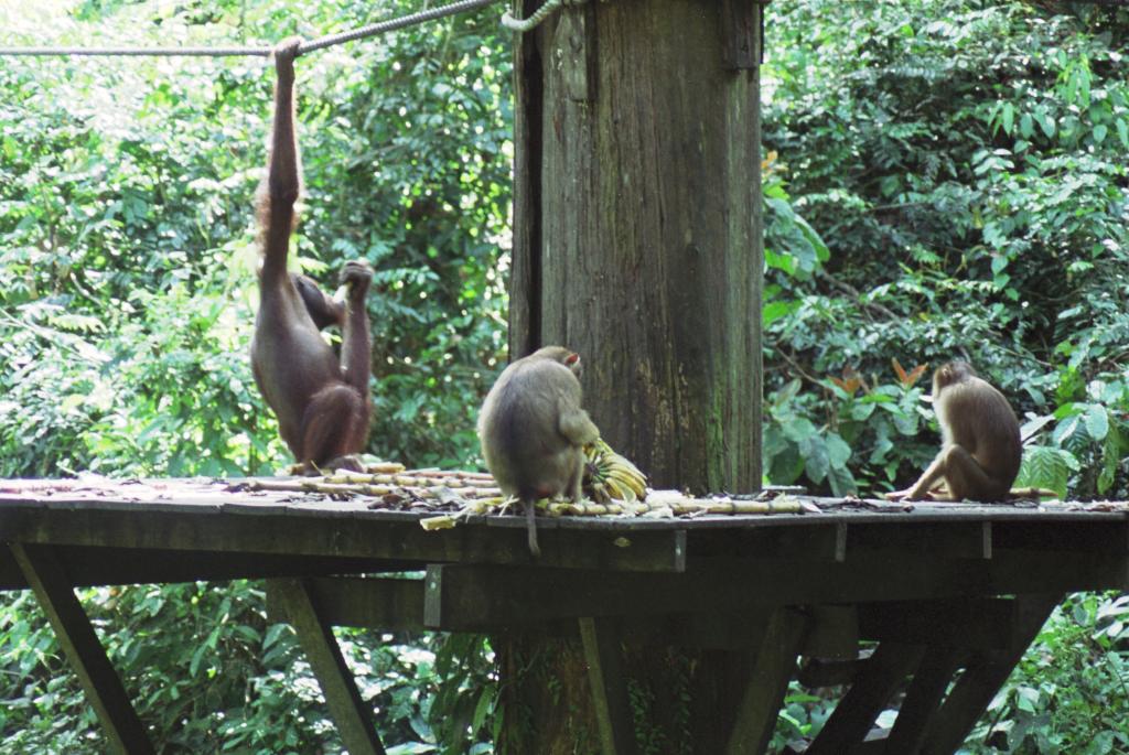 Macaques and orangutan "share" the meal