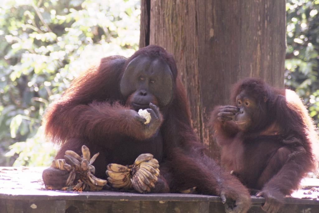 Dominant male and a female at the feeding platform -- Sepilock Orangutan Rehabilitation Center