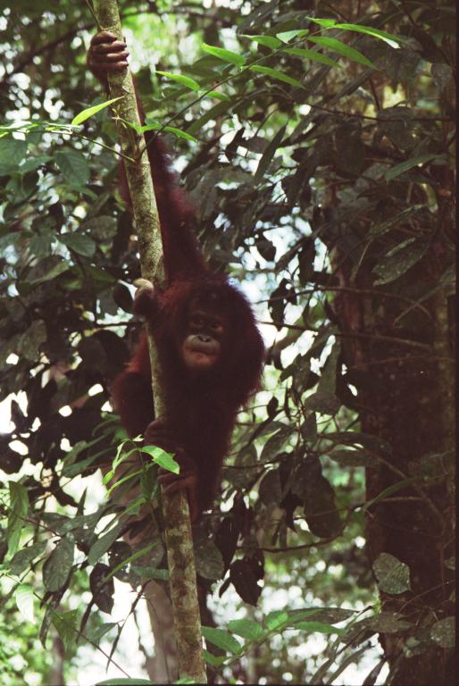 Young orangutan greats visitors walking to the feeding platform at Sepilock