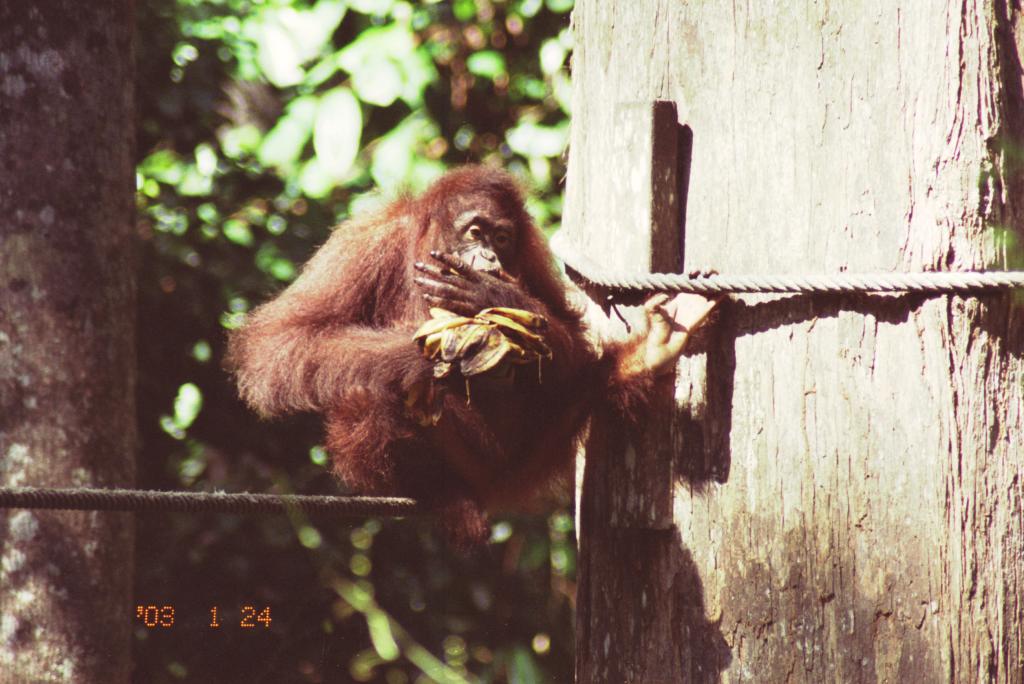 Orangutan eating bananas near the feeding platform -- Sepilock, Sabah, Malaysian Borneo