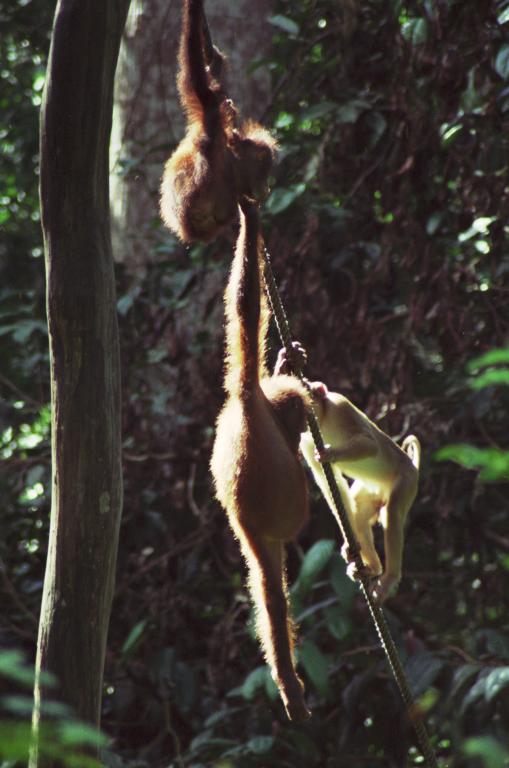 Two young orangutans and a macaque share a rope near the feeding platform -- Sepilock, Sabah, Malaysian Borneo