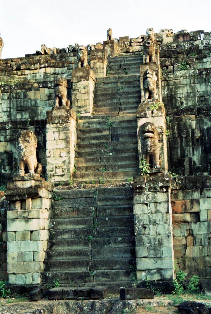 Lions guard the stairway at Phnom Bakheng