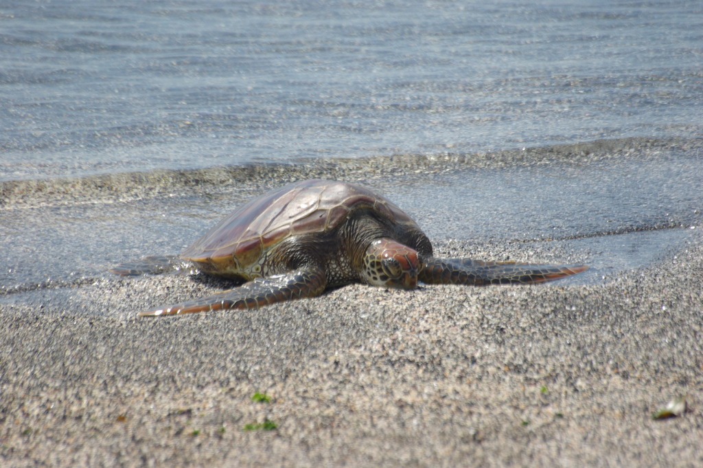 : Migrant turtle and marine iguanas share a Fernandina beach: January 4, 2009