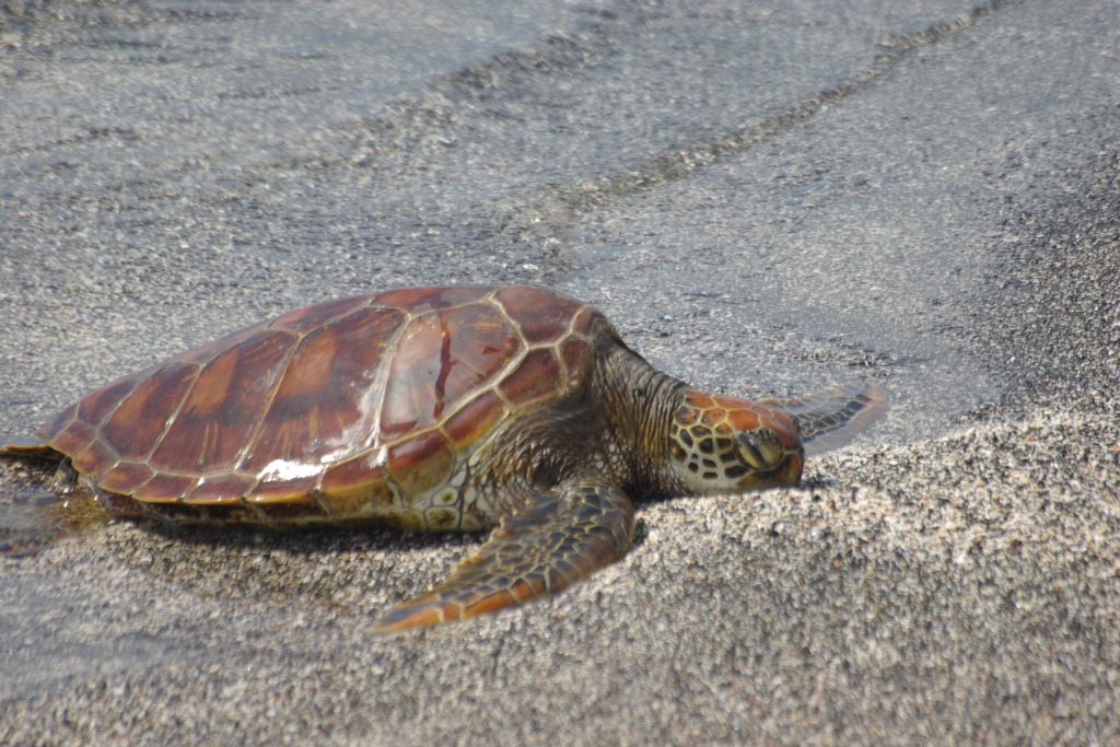 : Migrant turtle and marine iguanas share a Fernandina beach: January 4, 2009