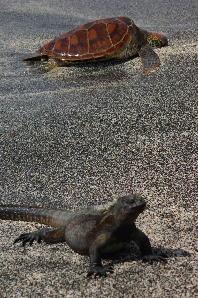 : Migrant turtle and marine iguanas share a Fernandina beach: January 4, 2009