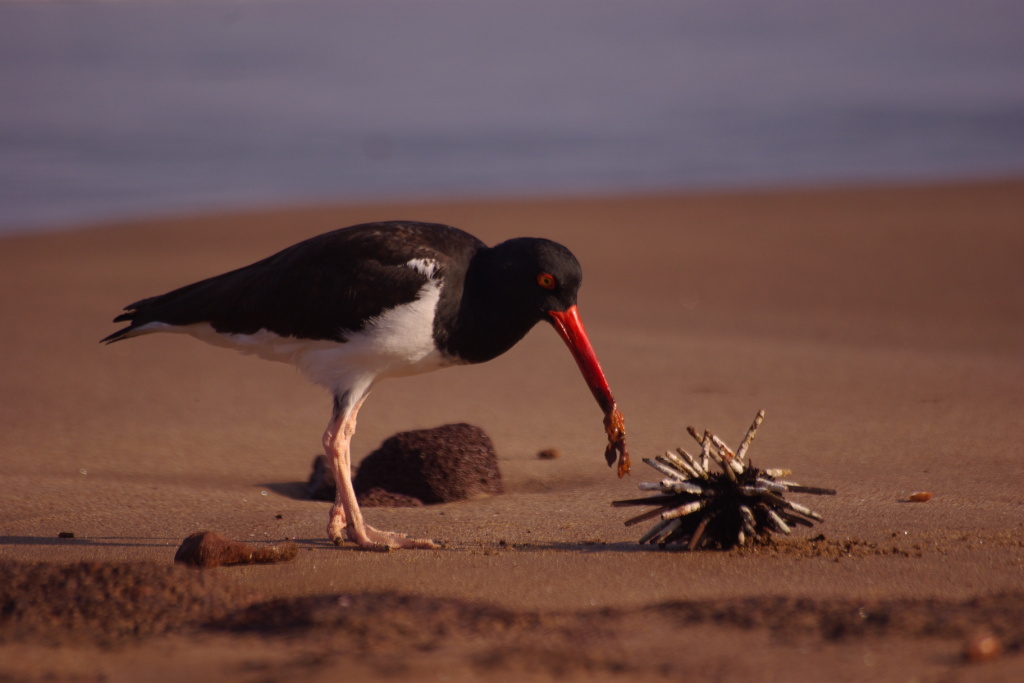 American flycatcher extracting a morsal from a stranded sea urchin