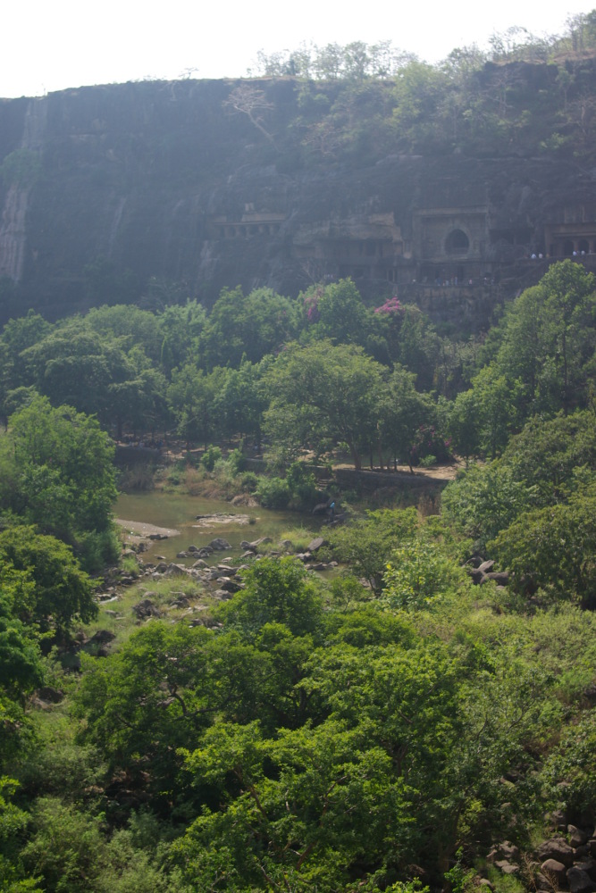 The Ajanta site: temple cave burrowed into the hill side facing a valley