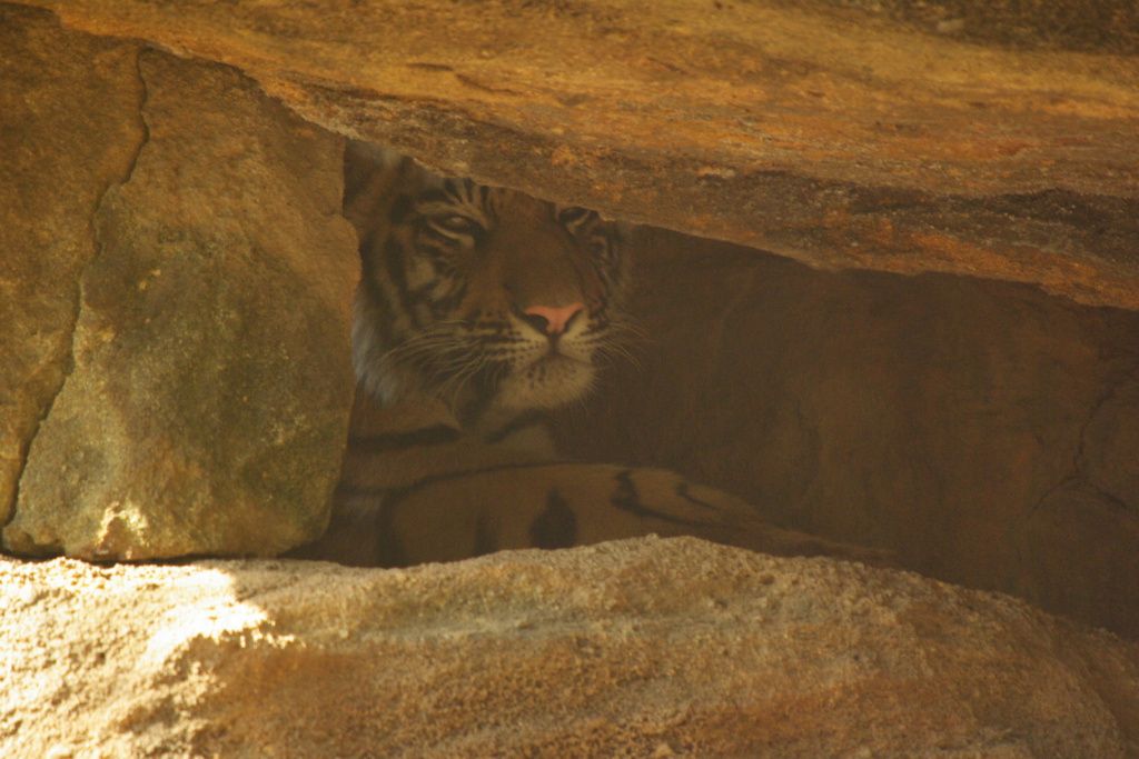 Tiger cub peers out from the rocks