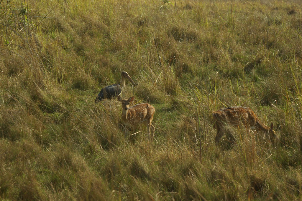 Black stork and a pair of spotted deer