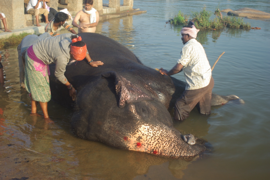 Lakshmi, the temple elephant gets a bath down by the ghats