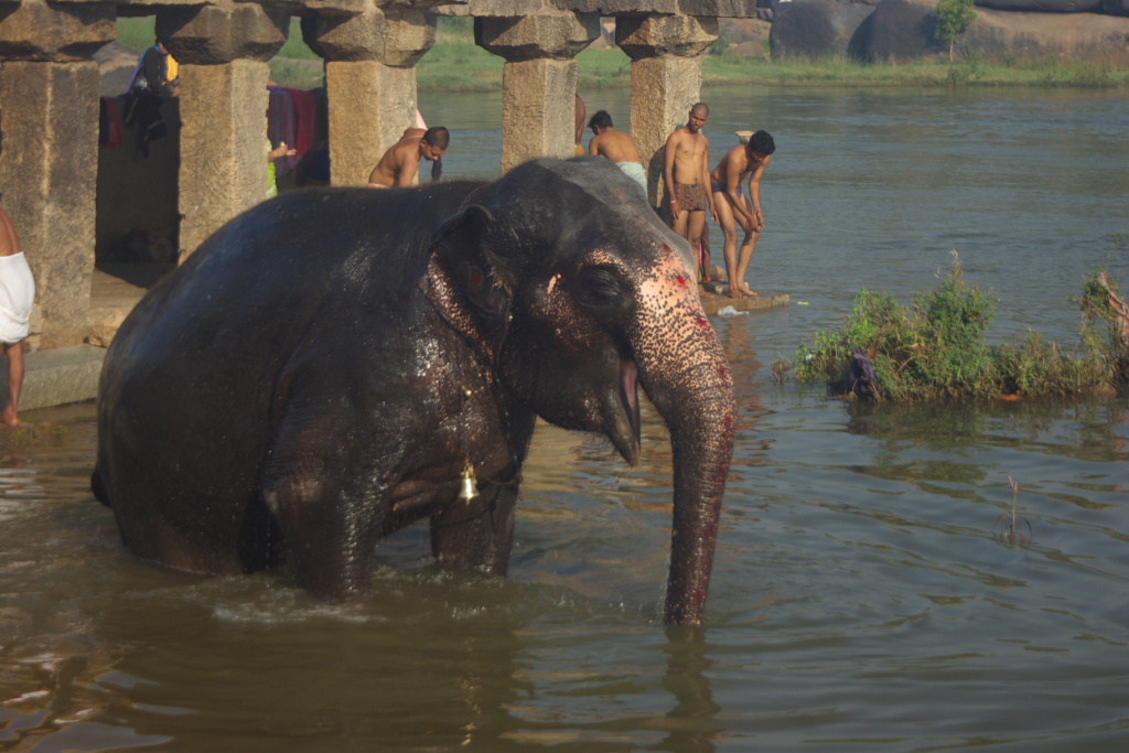 Lakshmi, the temple elephant gets a bath down by the ghats