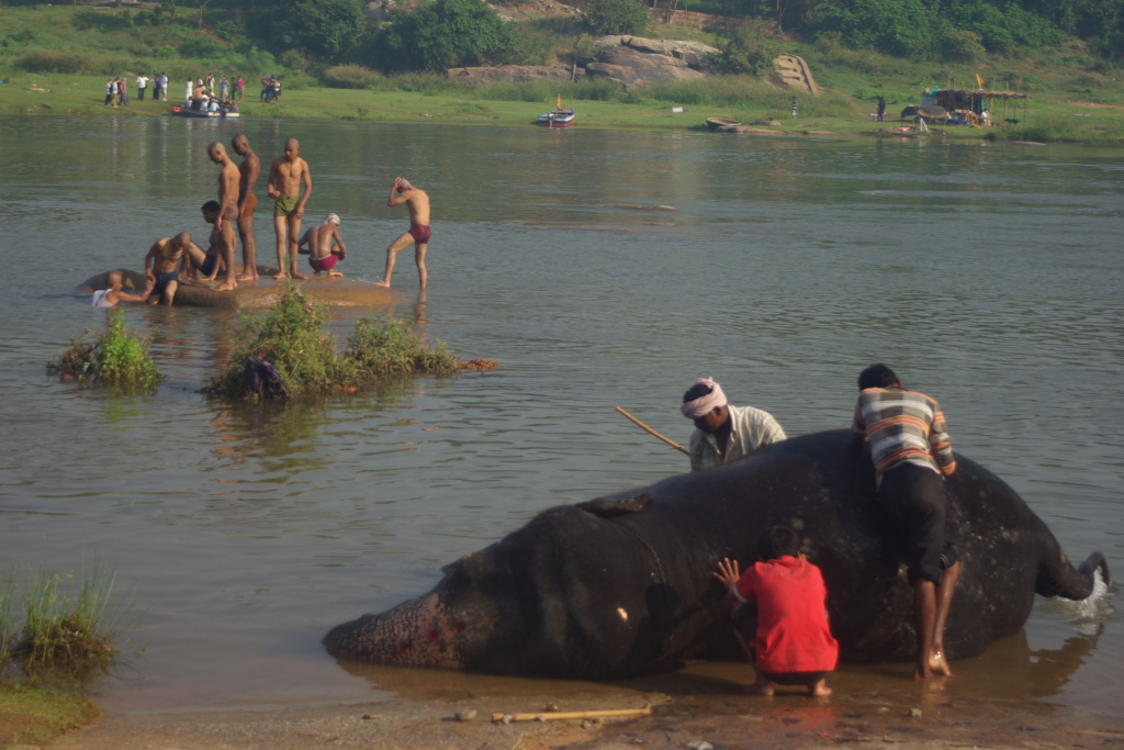 Lakshmi, the temple elephant gets a bath down by the ghats