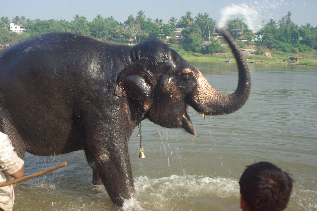 Lakshmi, the temple elephant gets a bath down by the ghats