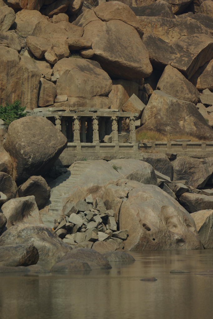 Telephoto shot of a small inaccessible temple on the far side of the river