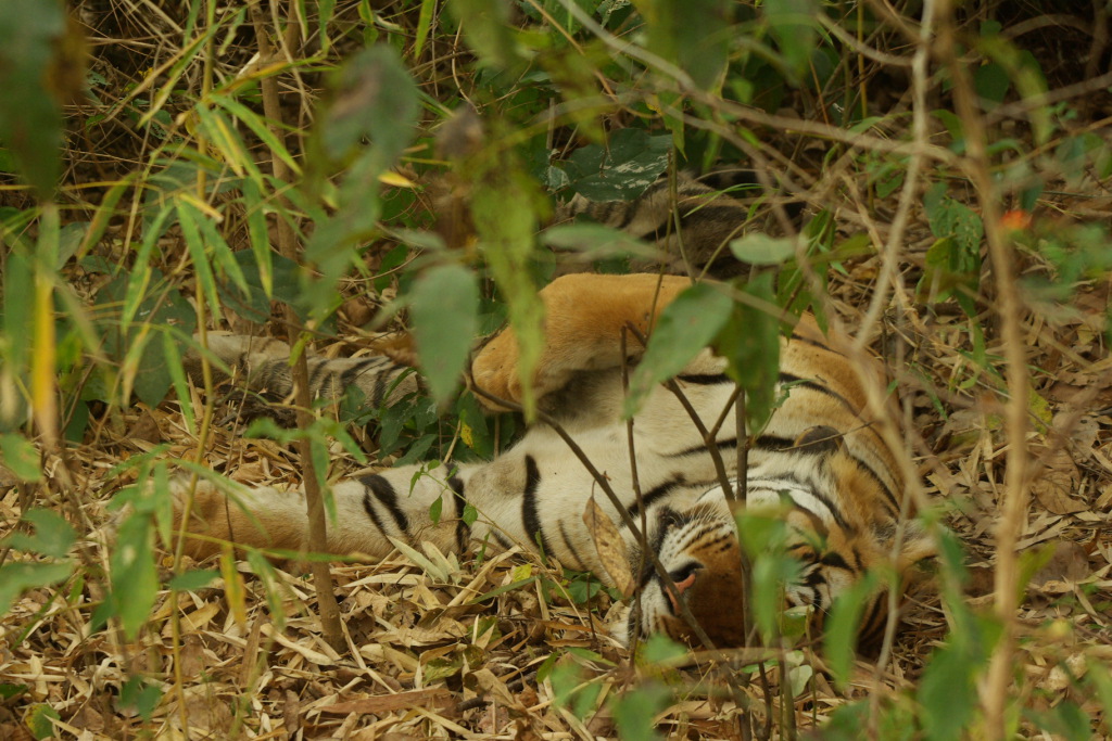 sleeping tiger seen from elephant back
