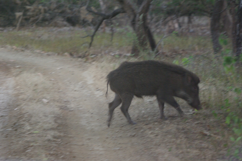 wild pigs cross the road in the dimming light