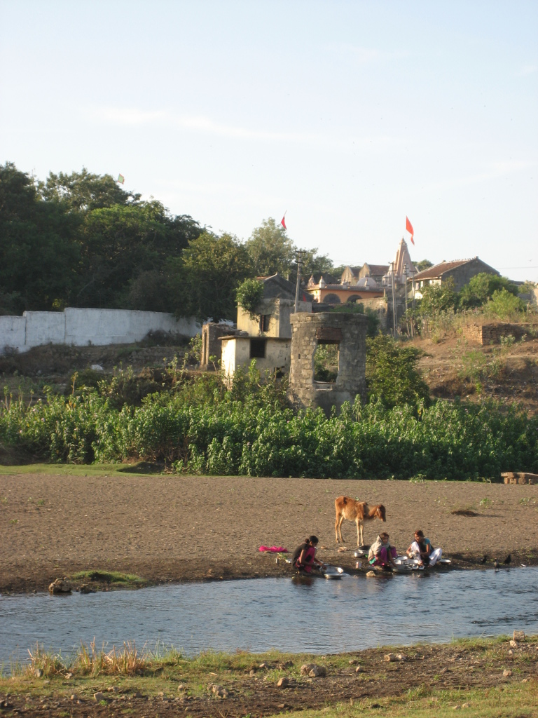 villagers bathe and wash clothes in the river