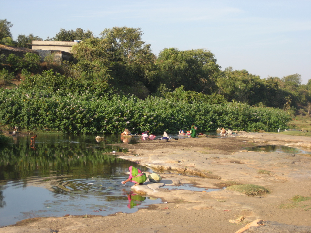 villagers bathe and wash clothes in the river