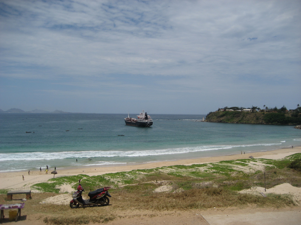 Giant titanium ore freighter anchored in the harbor at Fort Dauphin