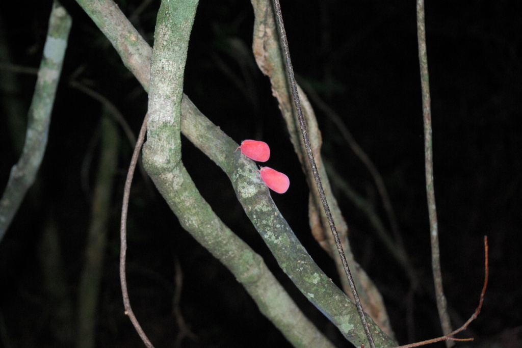 Pink insects cling to tree limbs