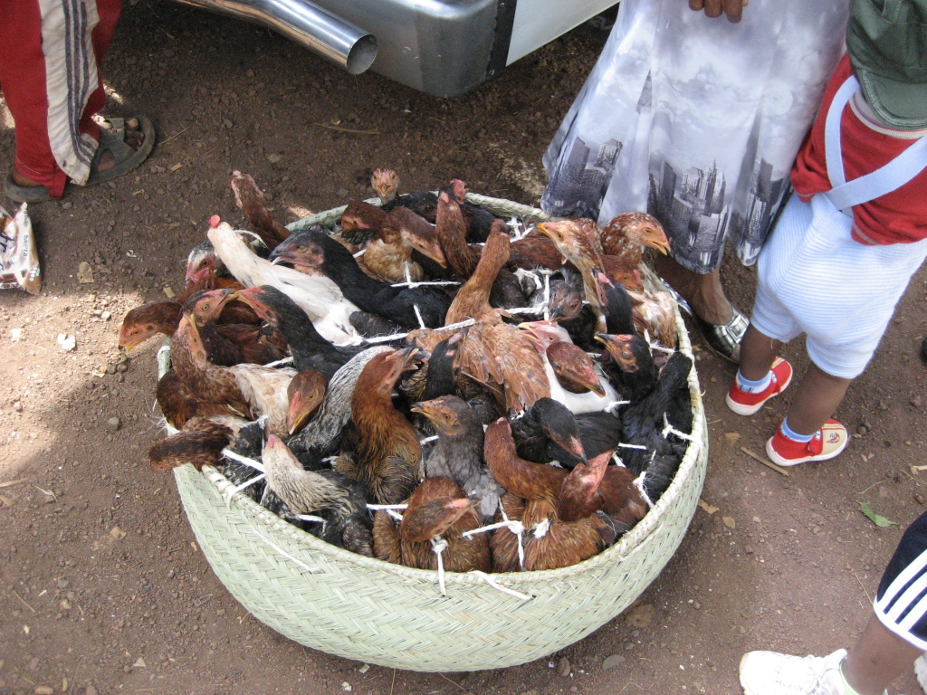 Chickens stuffed in a basket for travel: Antsirabe taxi-brousse station
