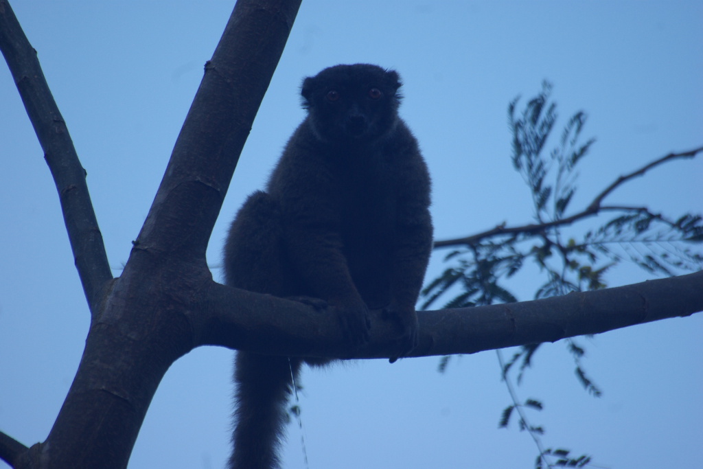 Appears to be an Eastern Gray Bamboo Lemur in silhouette