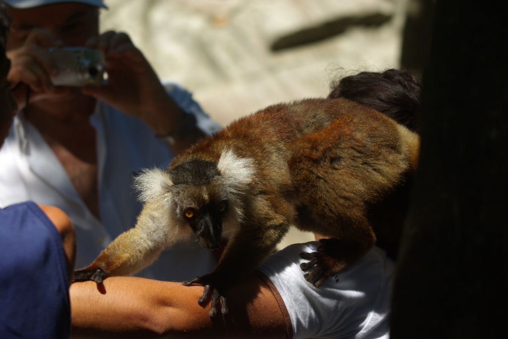 Female black lemur coaxed down to climb onto tourists by banana offering guides