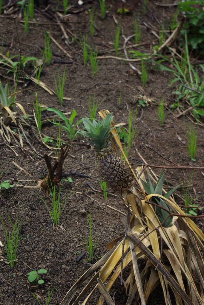 A pineapple grows in the ash of a torched field