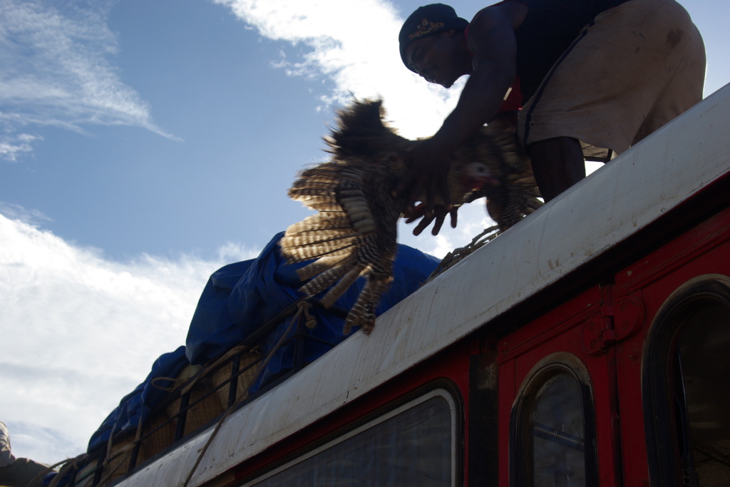 Live bound turkey being tossed onto the roof for transport